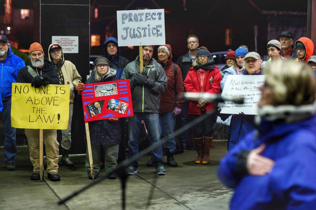 About 100 protesters met outside Juneau’s Hurff Ackerman Saunders Federal Building at 5 p.m. Some carried signs reading “nobody is above the law,” or “protect justice.”