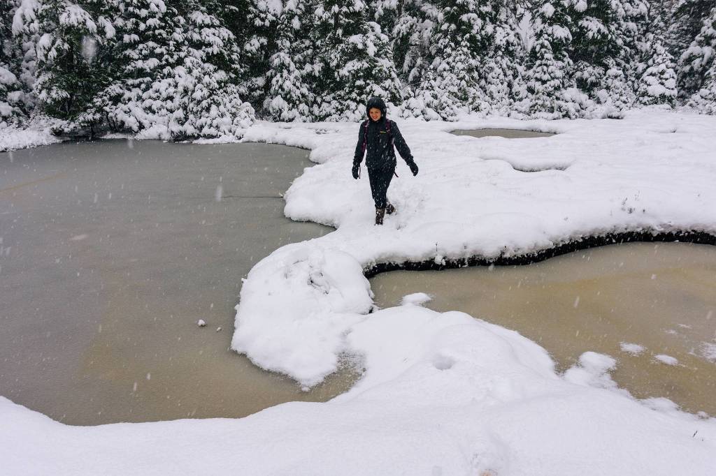 Ian McGonegal approaches edge of pond while snow continues to fall. (Gabe Donohoe | For the Juneau Empire)