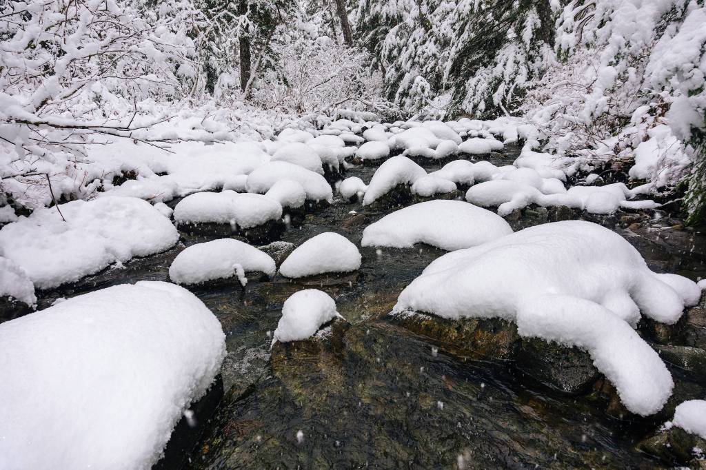 Snow collects on the tops the rocks protruding out of the stream. (Gabe Donohoe | For the Juneau Empire)