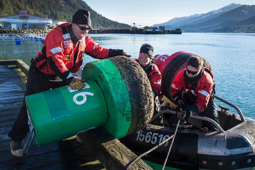 Andrew Tetrault, left, Kevin McManus, center, and Carl Sporleder from the U.S. Coast Guard Cutter Elderberry, a buoy tender based in Petersburg, lift a buoy onto the dock at the Wayside Park on Channel Drive on Monday, Nov. 5, 2018. The 19 buoys that mark the passage through the Mendenhall Bar were taken out for the season. (Michael Penn | Juneau Empire)