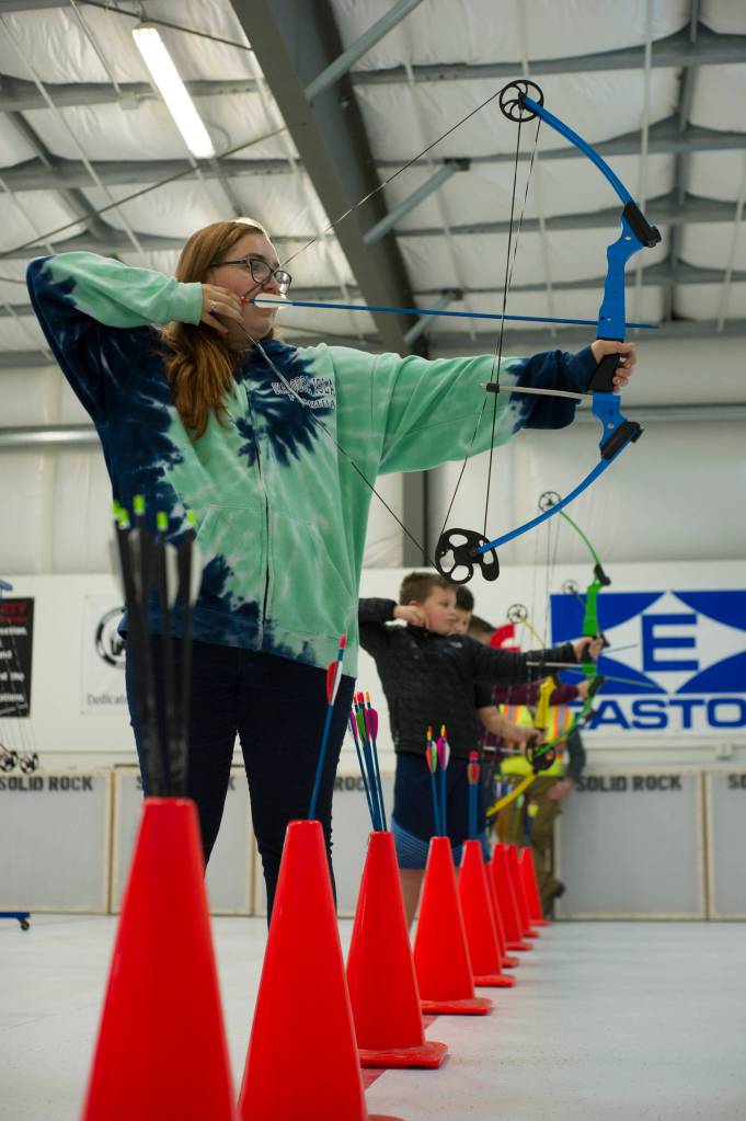 Ashley Carabajal shoots a bow during the Thanksgiving Turkey Shoot at the Alaska Department of Fish and Game Hunter Education Facility archery range on Saturday. The event was put on by the Juneau Gun Club, Juneau Shooting Sports Foundation, Juneau Archery Club and ADFG and awarded approximately 90 turkeys. (Nolin Ainsworth | Juneau Empire)