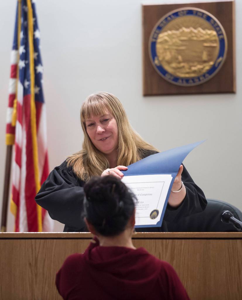 During her time in Therapeutic Court, her resolve was tested. Her father died. Her son was having health problems. Instead of turning to alcohol in these situations like she did earlier in life, Riley used them as motivation to stay strong and sober. Riley said she knew she had to take control of her own actions and her life, but she made sure to give credit to those who supported her in her adopted community of Juneau.