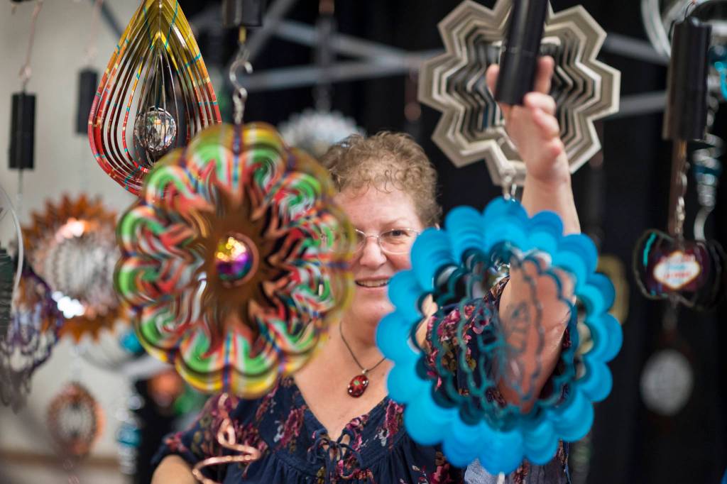 Marla Olsen hangs one of her wind spinners at the display booth she shares with her sister, Ruth, at the Public Market in the Elizabeth Peratrovich Hall on Friday, Nov. 23, 2018. (Michael Penn | Juneau Empire)