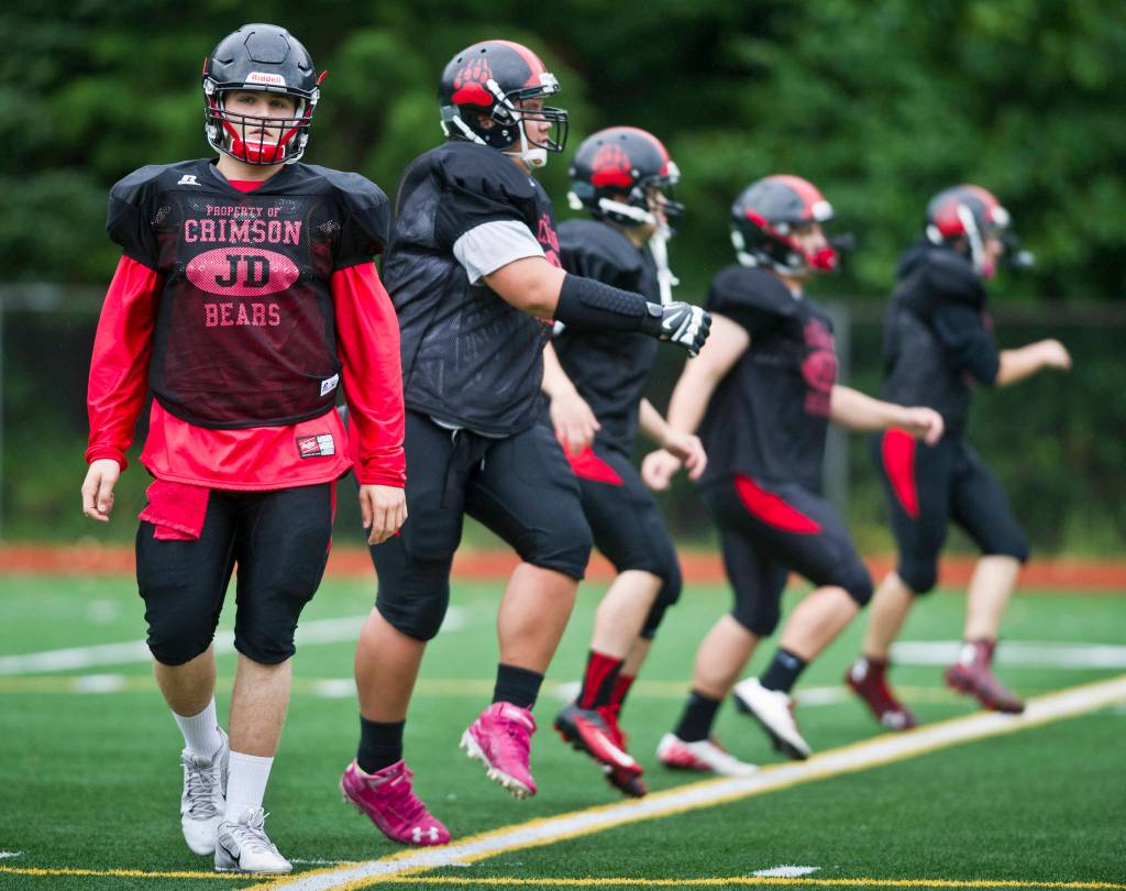 Hunter Hickok leads warmup drills during Juneau-Douglas High School varsity football practice in August of 2015. Hickok was twice named Southeast Conference Defensive Player Of The Year during his time with the Crimson Bears from 2012-2015. (Michael Penn | Juneau Empire File)