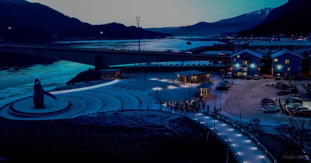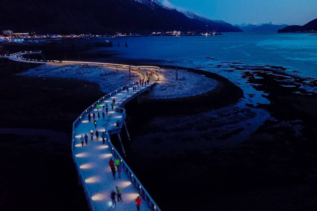 Headlamps came in handy during a darkened community run along the Juneau Seawalk on Saturday afternoon.