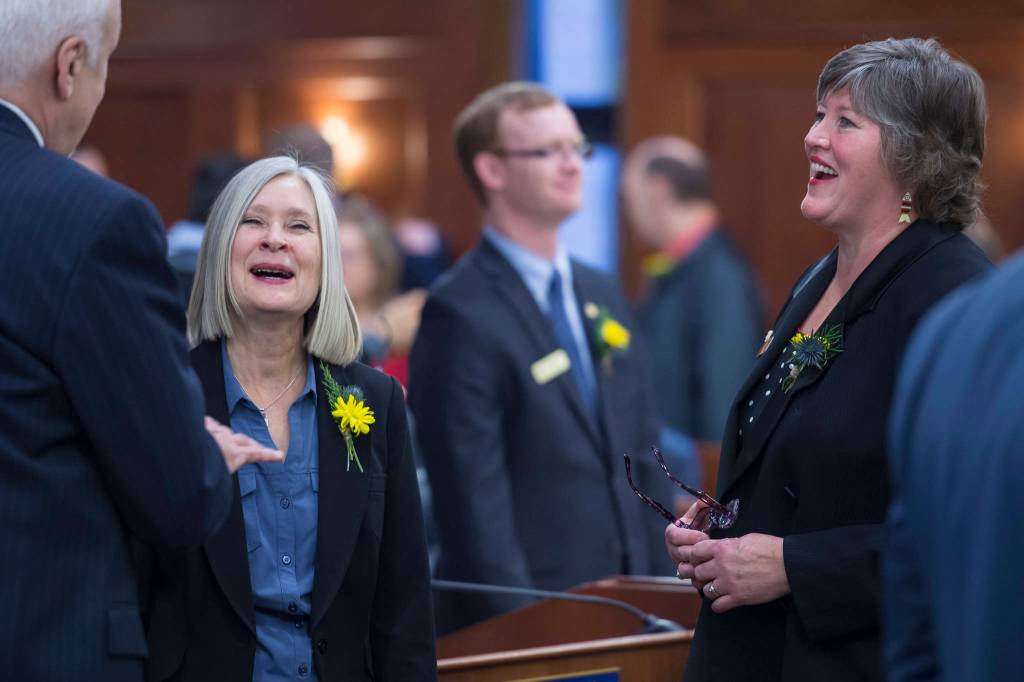 Rep. Louise Stutes, R-Kodiak, left, congratulates Rep. Sarah Vance, R-Homer, Rep. Gary Knopp, R-Kenai, and Rep. Ben Carpenter, R-Nikiski, right, after being sworn in on the opening day of the 31st Session of the Alaska Legislature on Tuesday, Jan. 15, 2019. (Michael Penn | Juneau Empire)