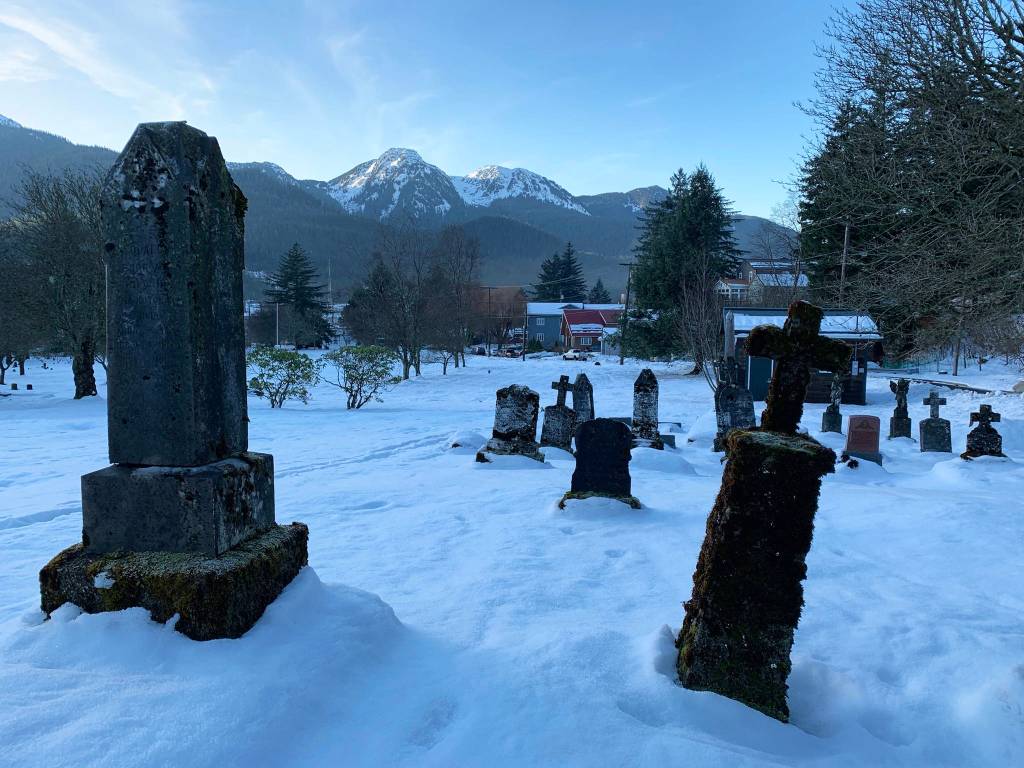 Each piece in Averyl Veliz’s 13-piece series of digital collage illustrations printed on aluminum examine downtown Juneau’s Evergreen Cemetery during either the winter or summer solstice.