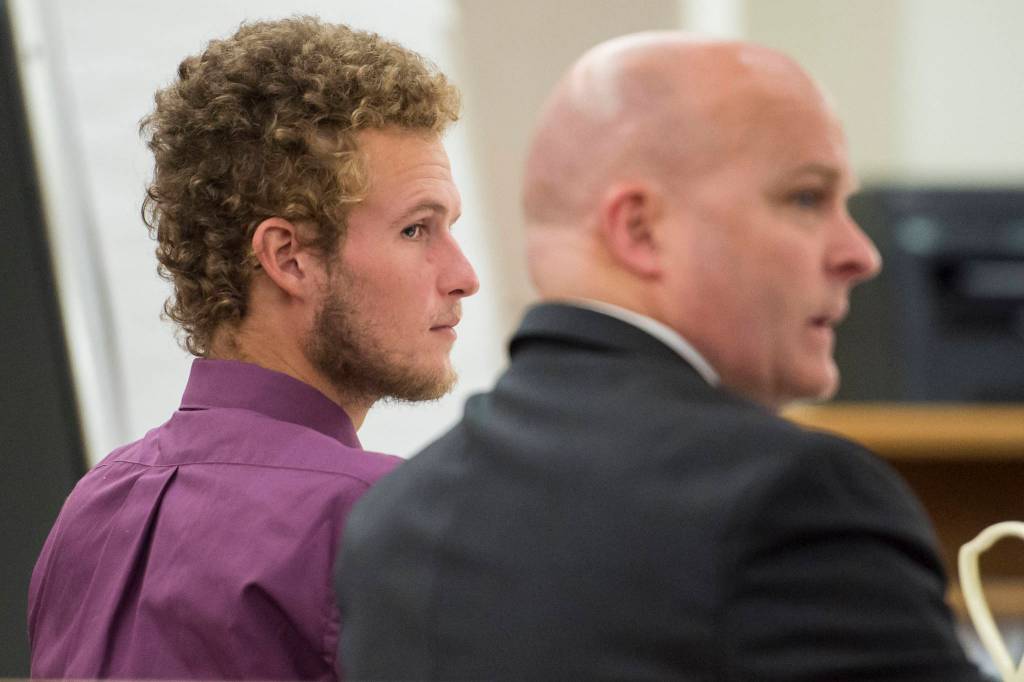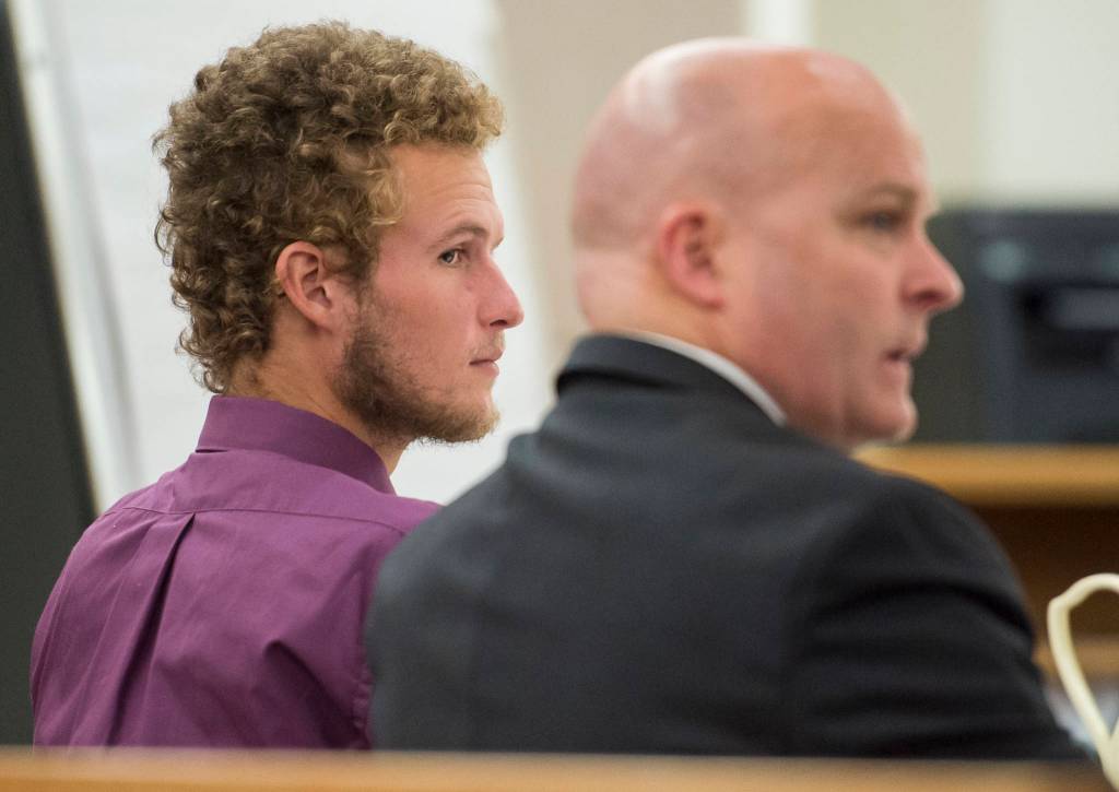 Ty Grussendorf, 24, left, appears in Juneau Superior Court with his attorney, John P. Cashion, to plead guilty to two counts of sexual abuse of a minor on Monday, Oct. 22, 2018. (Michael Penn | Juneau Empire File)