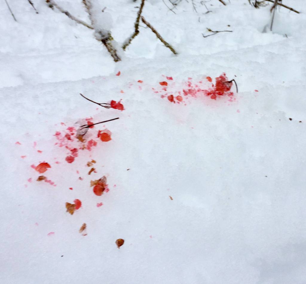Presently, we began to see red — fragments of highbush cranberries in numerous, widespread patches on top of snow-covered logs and hummocks. There were a few whole berries, but in nearly all cases the seeds had been extracted, leaving bits of red pulp and fruit skins. Aha! Pine grosbeaks had been at work! Part of their scientific name reflects this behavior: “enucleator” meaning seed (or nut) extractor, although they also eat many other kinds of seeds, buds and insects. They typically nest in open conifer forests of boreal North America and Eurasia; here, in fall and winter, at least, they regularly enucleate highbush cranberries.