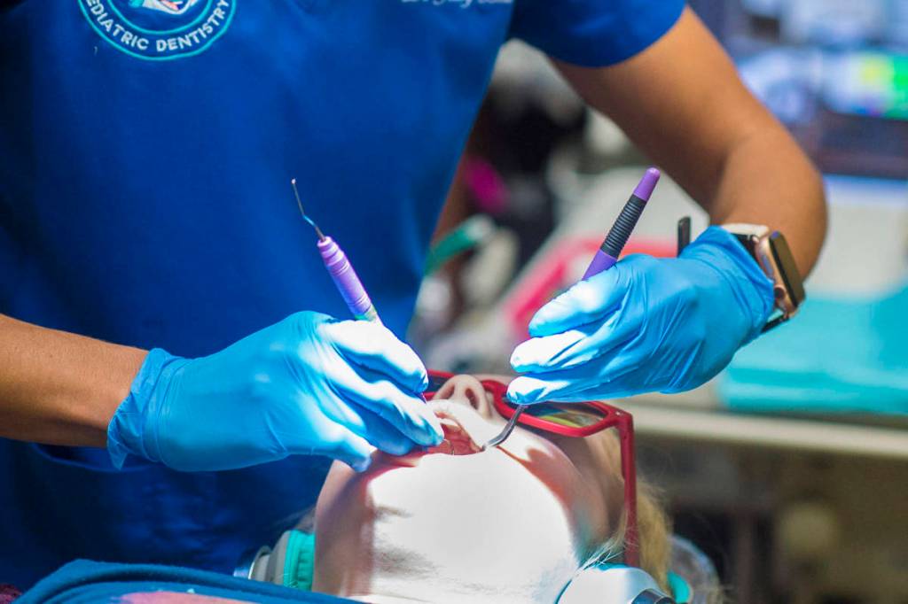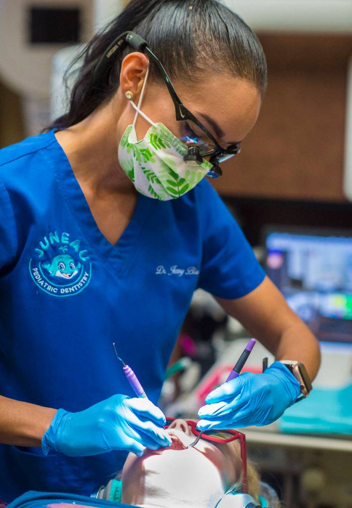 Dr. Jessica Blanco, of Juneau Pediatric Dentistry, provides a checkup on Tynly Booth, 8, on Monday, Jan. 14, 2019. Tynly was given a topical fluoride varnish as part of her checkup. (Michael Penn | Juneau Empire)