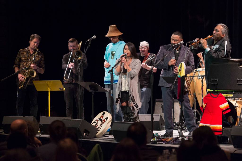 Audience members stand to a prayer song performed by Khu.eex’ at Centennial Hall on Monday, Jan. 28, 2019. (Michael Penn | Juneau Empire)