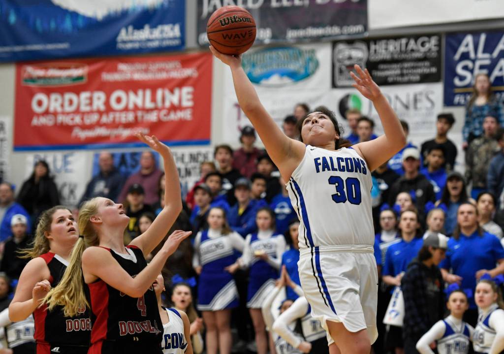 Thunder Mountain’s Tasi Fenumiai lays the ball up against Juneau-Douglas’ Sadie Tuckwood and Skylar Hickok at TMHS on Friday, Feb. 1, 2019. (Michael Penn | Juneau Empire)