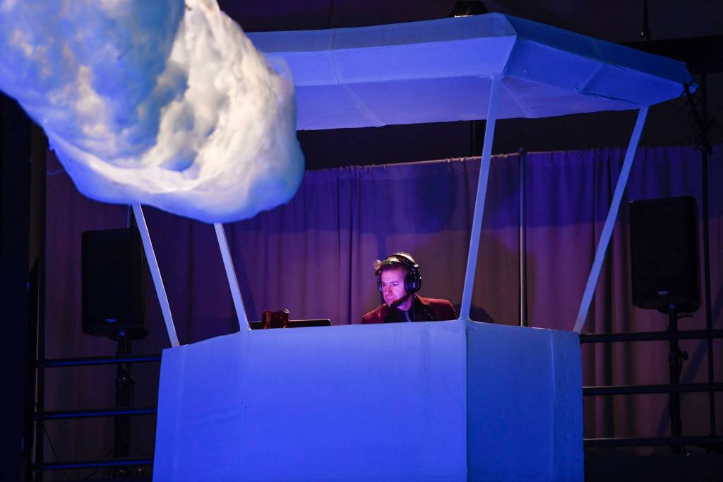 DJ Manu takes control of the air waves from his control tower at the Wearable Art show at Centennial Hall on Saturday, Feb. 16, 2019. (Michael Penn | Capital City Weekly)