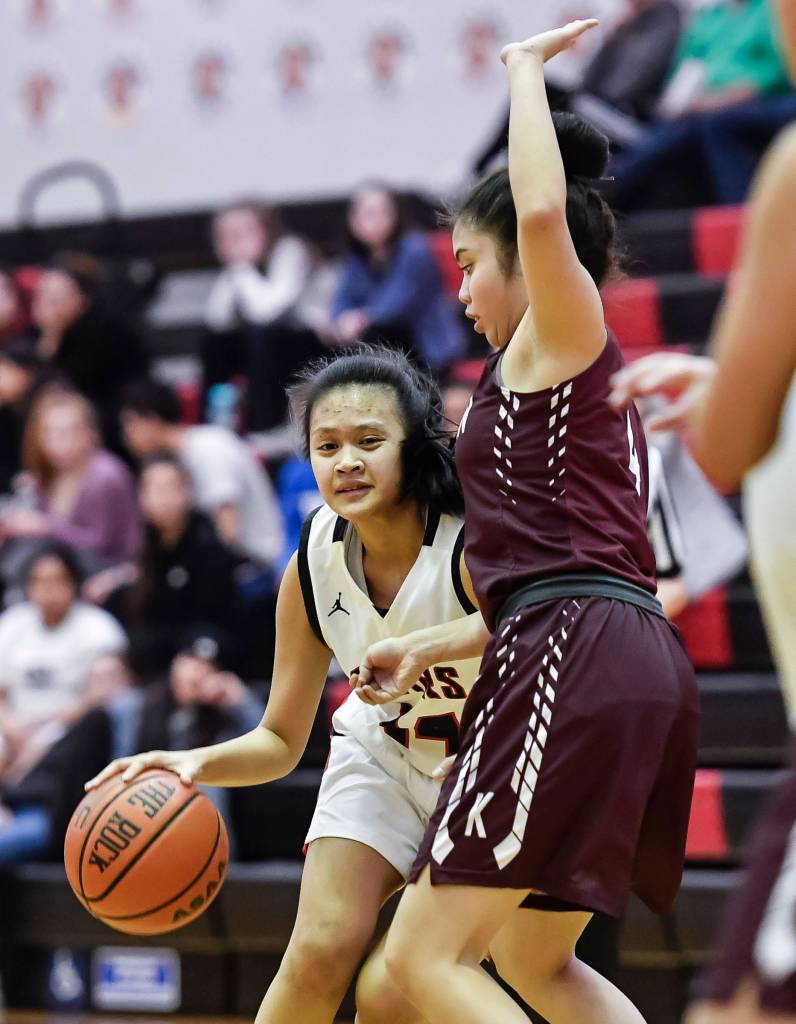 Juneau-Douglas’ Alyxn Bohulano, right, looks to pass against Ketchikan’s Lianne Guevarra at JDHS on Friday, Feb. 22, 2019. JDHS won 56-38. (Michael Penn | Juneau Empire)