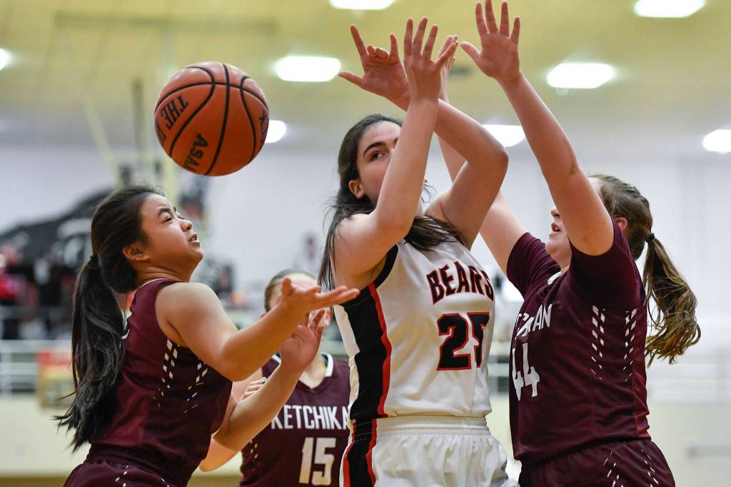 Juneau-Douglas’ Chloe McAdams has the ball knocked away by Ketchikan’s Shaelynn Mendoza, left, and Dyllan Borer at JDHS on Friday, Feb. 22, 2019. JDHS won 56-38. (Michael Penn | Juneau Empire)
