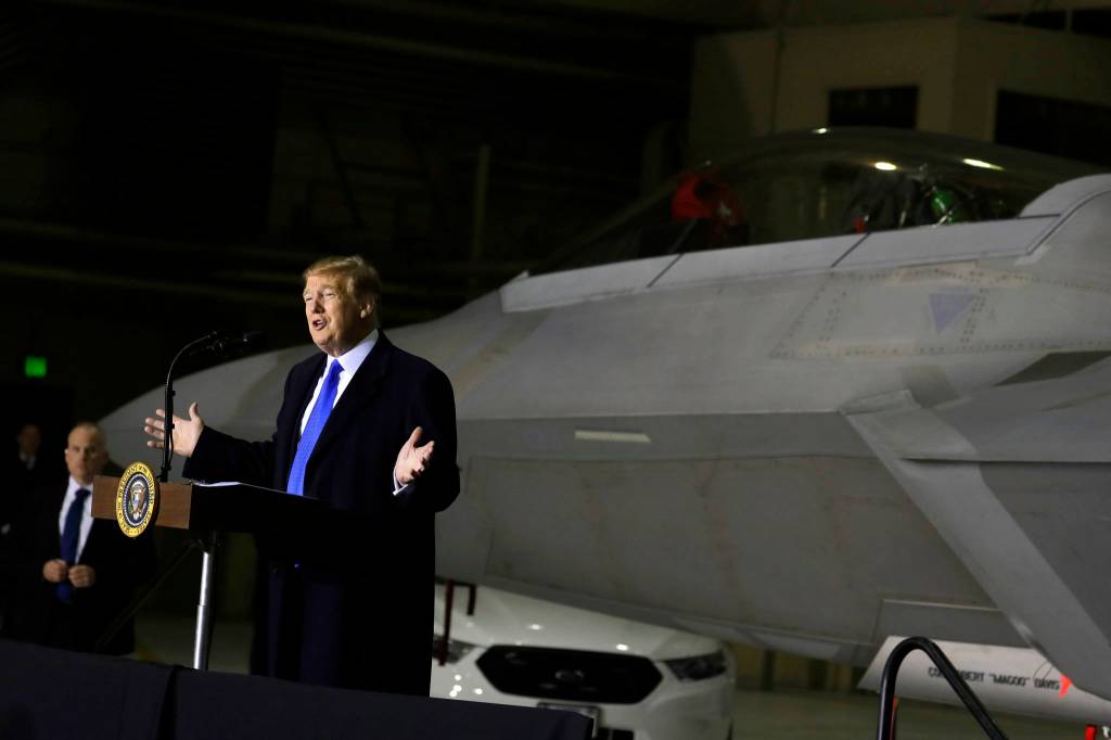 Standing in front of an F-22 Raptor fighter jet at an Anchorage base, Trump thanked all those serving in the military in Alaska, “our country’s last frontier as America’s first line of defense.”