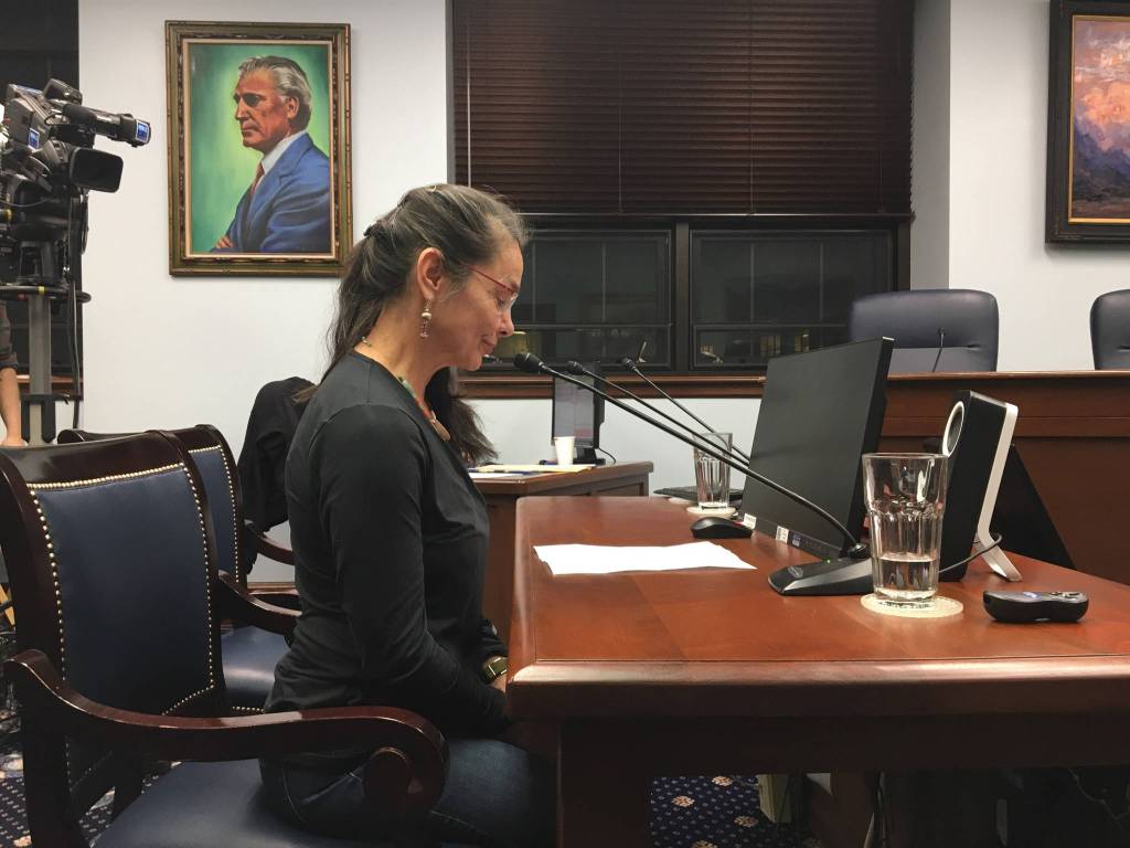 Laura Stats of Juneau testifies against Gov. Mike Dunleavy’s payback dividend bills, Senate Bills 23 and 24, during a Senate State Affairs Committee meeting, Thursday night. Stats said these bills would cause “chaos” in Alaska, because of the services that must be cut to fund these Senate Bills. (Kevin Baird ι Juneau Empire).