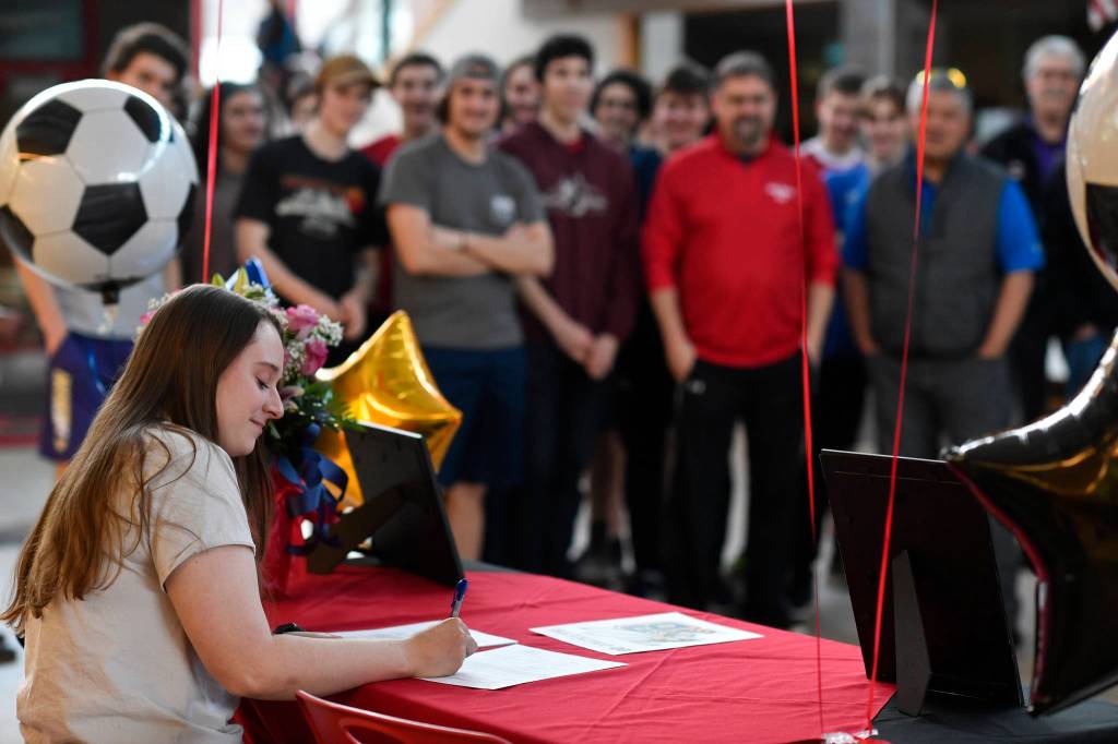 As classmates, friends and famiy watch, senior Shaylin Cesar signs a national letter of intent on Monday, Feb. 25, 2019, at Juneau-Douglas High School: Yadaa.at Kalé to play soccer at Montana State University Billings next year. (Michael Penn | Juneau Empire)