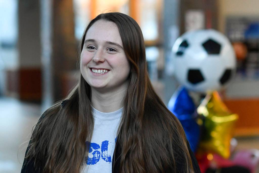 Senior Shaylin Cesar gets ready to sign a national letter of intent on Monday, Feb. 25, 2019, at Juneau-Douglas High School: Yadaa.at Kalé to play soccer at Montana State University Billings next year. (Michael Penn | Juneau Empire)