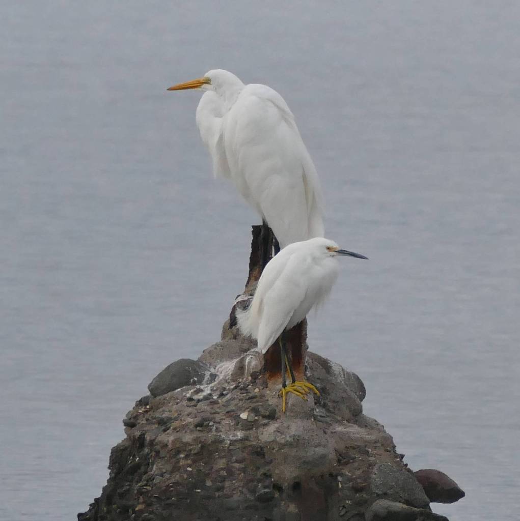 Another interesting heron was the little blue heron, much smaller than the familiar great blue heron (also present) and decked out in lovely shades of grayish blue. This species is unusual because the juveniles are pure white during their first year (and easy to confuse, on a quick glance, with the white egrets), and the legs looked greenish to me. They start to get the blue plumage in their second year. I have to wonder why they have such a distinctive juvenile plumage.