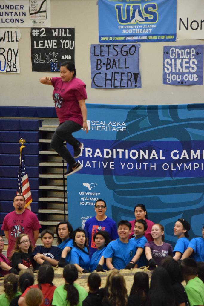 Traditional Games official and former World Eskimo-Indian Olympics blanket toss winner Marjorie Tahbone shows off her skills to kick off the 2019 Traditional Games at Thunder Mountain High School on March 16, 2019. (Nolin Ainsworth | Juneau Empire)