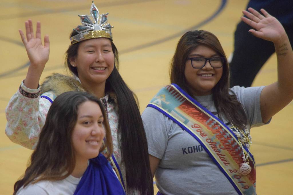 Northern Arizona University’s Miss Indigenous Shondiin Mayo, center, greets the crowd at the 2019 Traditional Games at Thunder Mountain High School on Saturday, March 16, 2019. Mayo and several others from NAU are participating in the two-day event featuring the traditional games of the Alaska Native peoples. (Nolin Ainsworth | Juneau Empire)