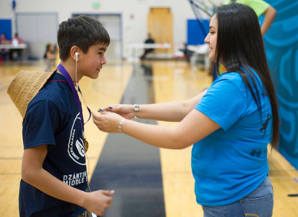 Native Youth Olympics official Sarah Aceveda, right, presents Dzantik’i Heeni Middle School’s Nathan Blake with the boys sportsmanship award at the conclusion of the 2019 Traditional Games at Thunder Mountain High School on Sunday. (Nolin Ainsworth | Juneau Empire)