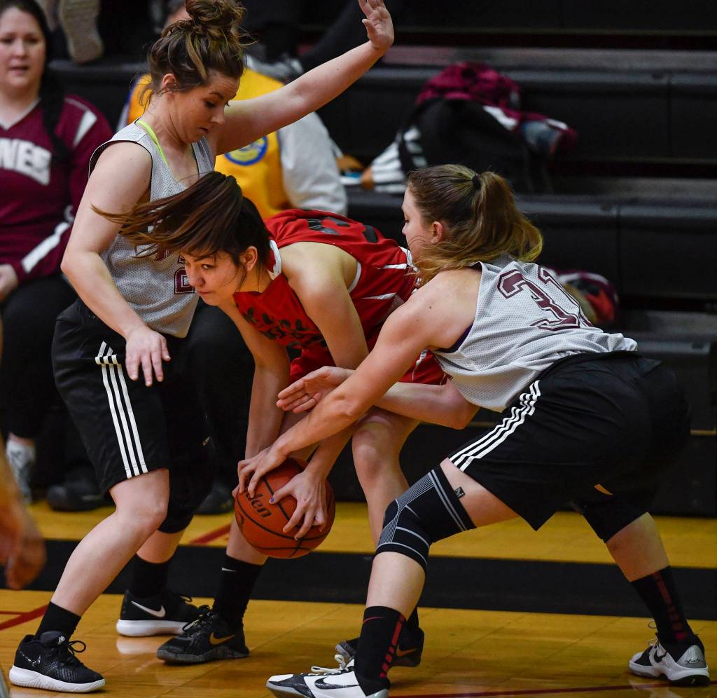 Hoonah’s Alice Johnson, center, comes up with a loose ball between Haines’ Karlie Spud, left, and Rachel Brittenham in the women’s bracket game at the Gold Medal Basketball Tournament on Thursday, March 21, 2019. (Michael Penn | Juneau Empire)
