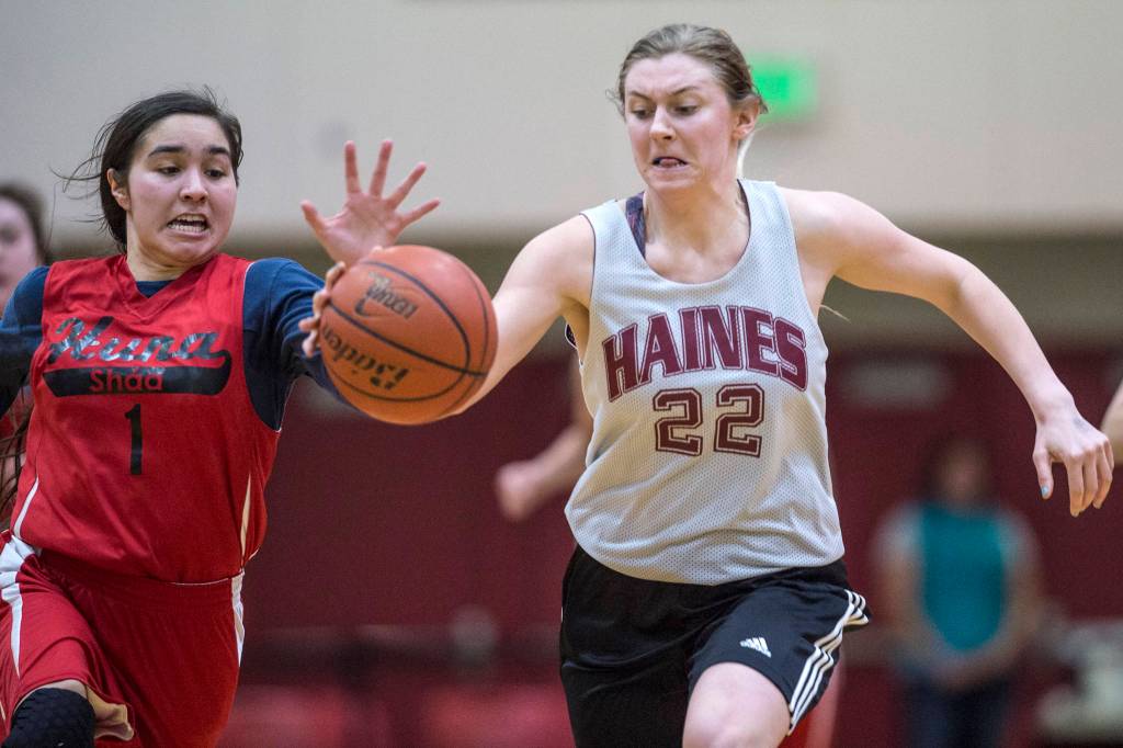 Hoonah’s Melissa Fisher, left, attempts a steal against Haines’ Liz Segars in the women’s bracket game at the Gold Medal Basketball Tournament on Thursday, March 21, 2019. (Michael Penn | Juneau Empire)