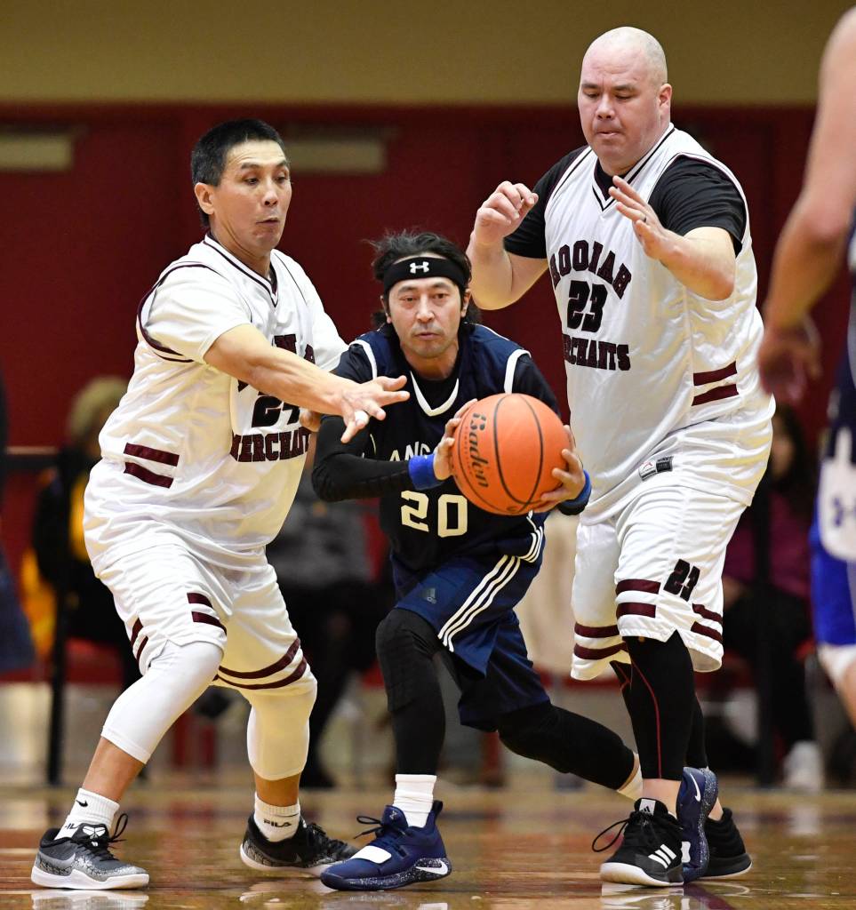 Angoon’s Sterling Bolima, center, is trapped by Hoonah’s Ken Willard Jr., left, and Andy Gray in a masters bracket game at the Juneau Lions Club 73rd Annual Gold Medal Basketball Tournament at Juneau-Douglas High School: Yadaa.at Kalé on Wednesday, March 20, 2019. Hoonah won 75-44. (Michael Penn | Juneau Empire)