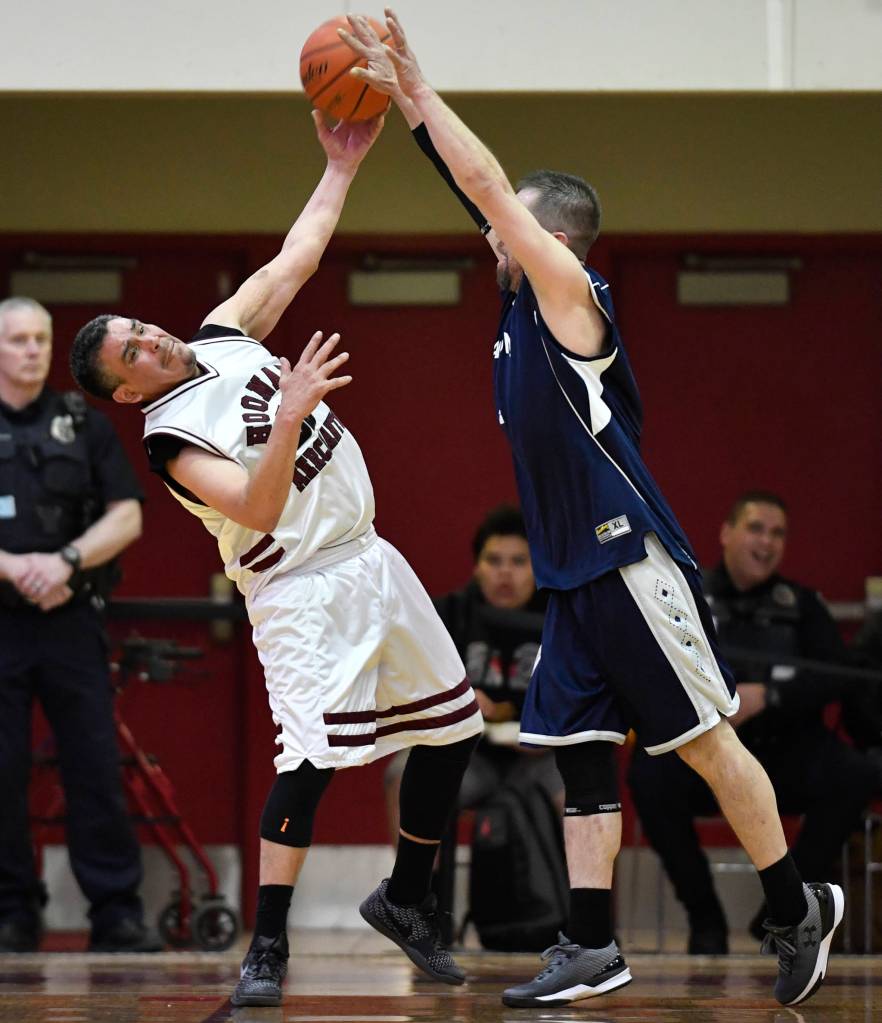 Angoon’s Jeff Duncan, left, shoots against Hoonah’s Marti Fred in a masters bracket game at the Juneau Lions Club 73rd Annual Gold Medal Basketball Tournament at Juneau-Douglas High School: Yadaa.at Kalé on Wednesday, March 20, 2019. Hoonah won 75-44. (Michael Penn | Juneau Empire)