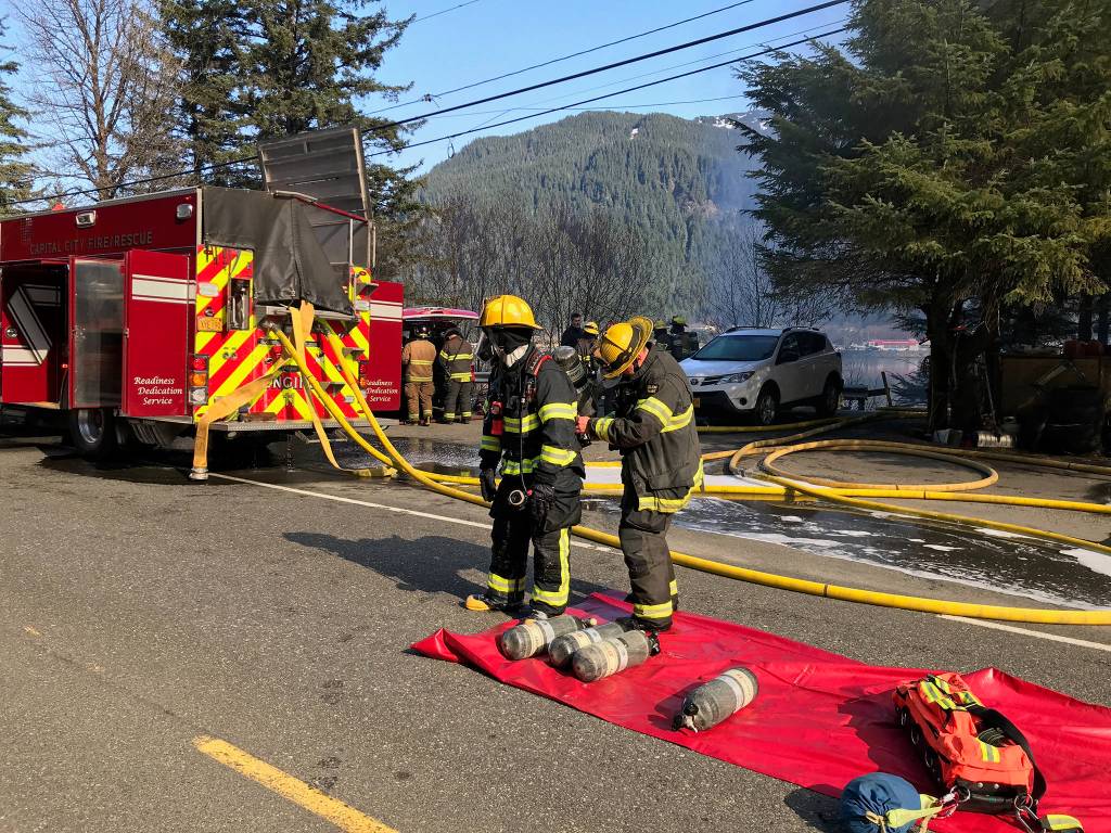 Firefighters work a house fire on North Douglas Highway on Thursday, March 28, 2019. (Michael Penn | Juneau Empire)
