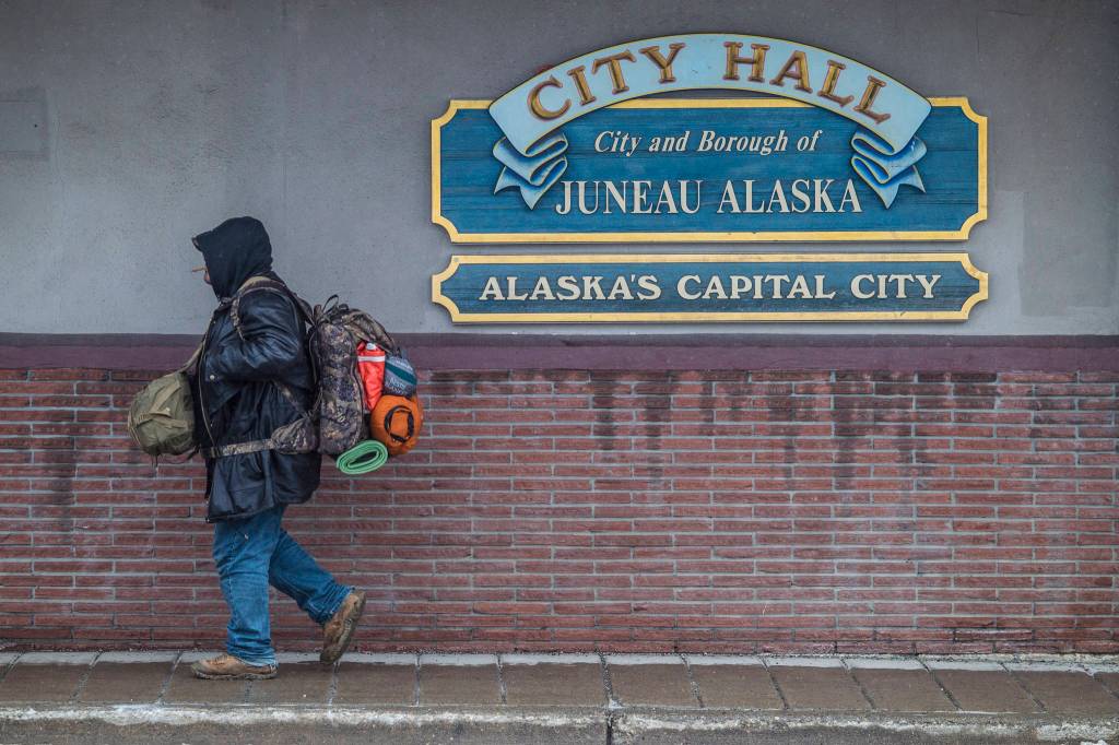 In this Feb. 12, 2019 photo, a man with camping gear walks by City Hall. (Michael Penn | Juneau Empire)