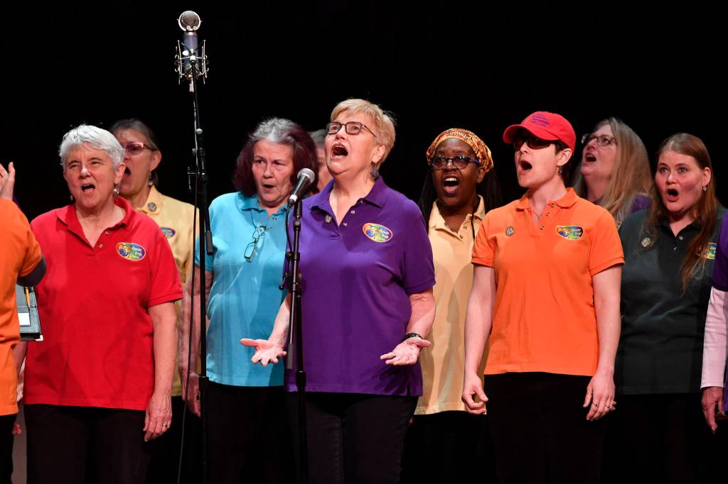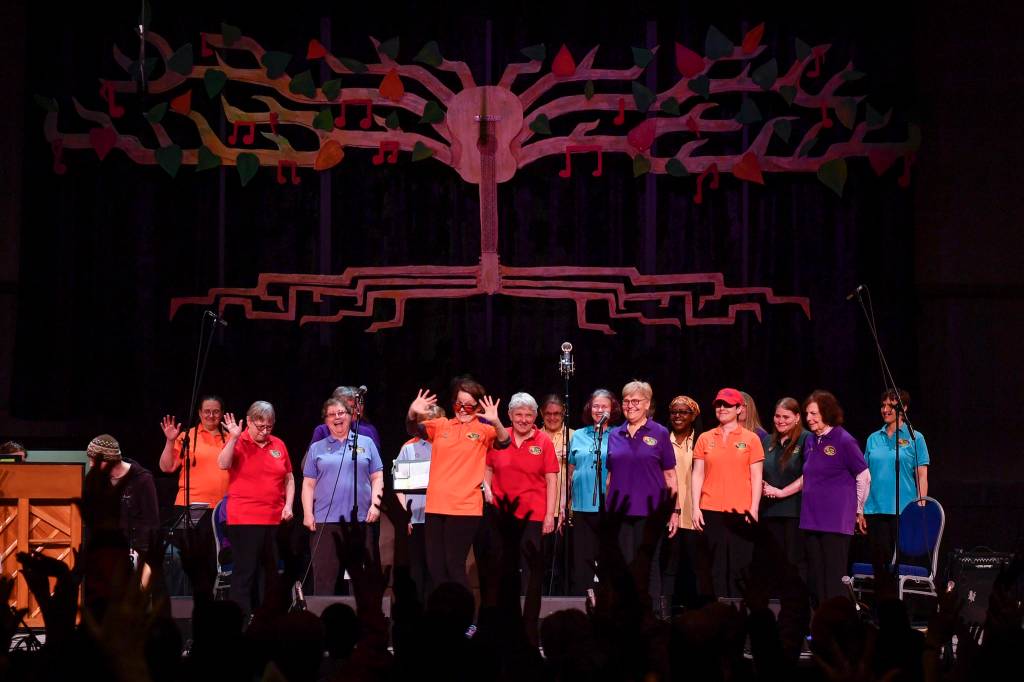 Members of the PFLAG/Juneau Pride Chorus perform at the 45th annual Alaska Folk Festival at Centennial Hall on Monday, April 8, 2019. (Michael Penn | Juneau Empire)