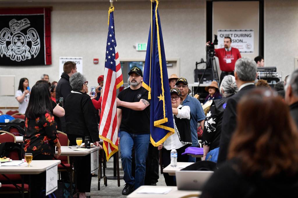 Southeast Alaska Native Veterans bring the colors during the opening of the three day 84th annual Tribal Assembly of the Central Council of Tlingit and Haida Indian Tribes of Alaska at the Elizabeth Peratrovich Hall on Wednesday, April 10, 2019. (Michael Penn | Juneau Empire)
