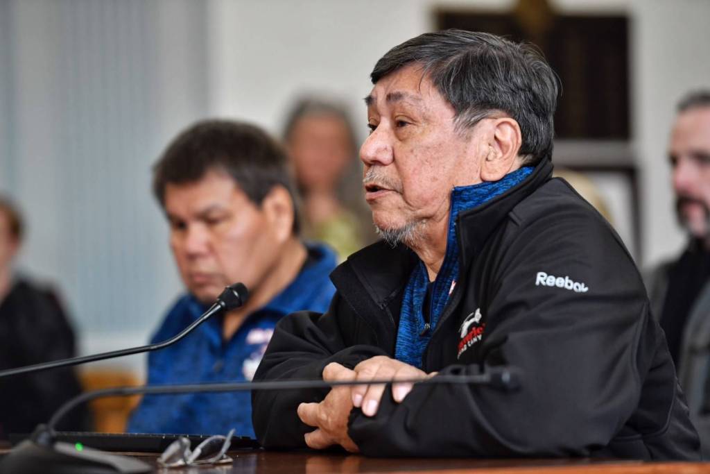 Henrich Kadake, former mayor of Kake, and his cousin Delbert Kadake, left, testify during public testimony on the state budget in the Senate Finance Committee hearing on Friday, April 12, 2019. Kadake explained how poor ferry service was hurting their community. (Michael Penn | Juneau Empire)
