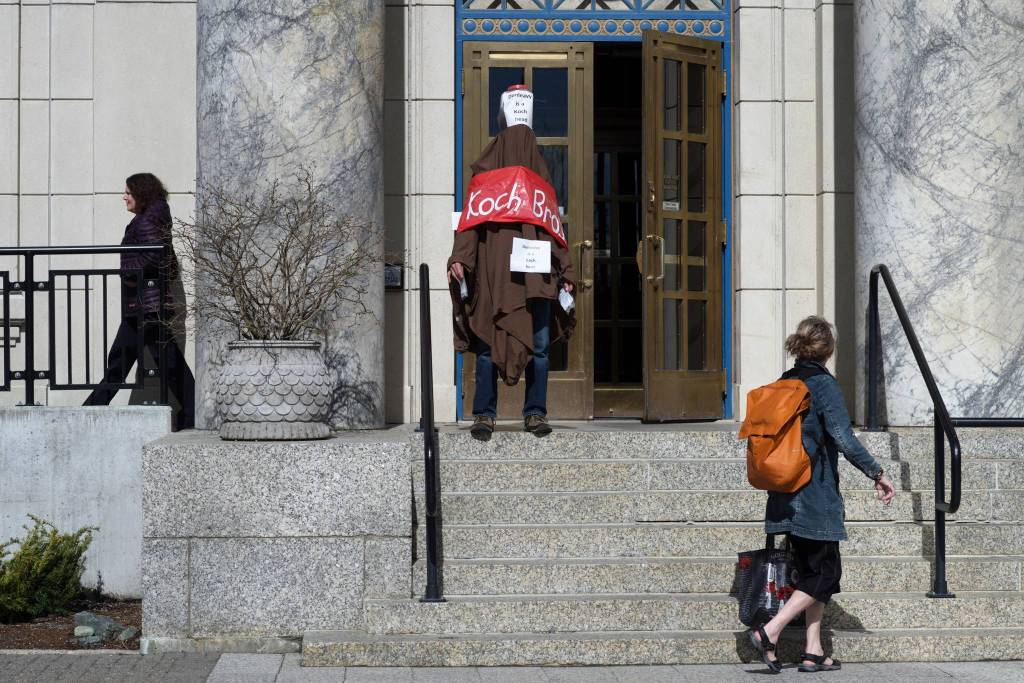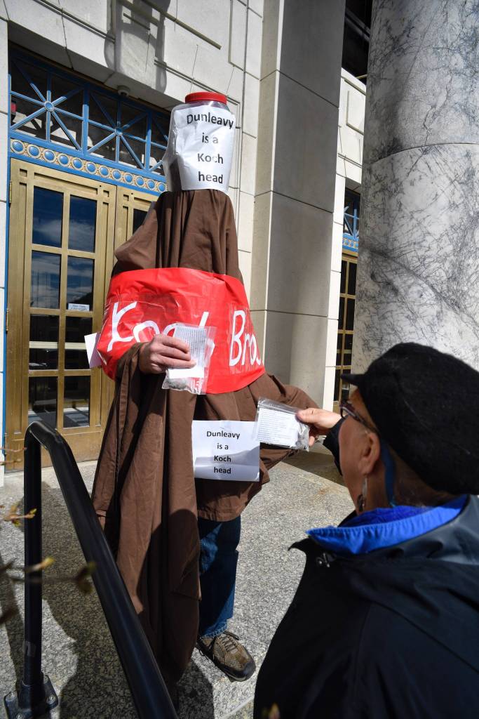 An anonymous protester, dressed as a Coke bottle, hands out moose poop as Gov. Mike Dunleavy’s budget to Sue Christiansen on the steps of the Capitol on Monday, April 15, 2019. The protester said, “Oh you’ve got to have a little humor in the whole thing because it’s starting to be a sad country. People don’t make laws anymore, it’s corporations that do for their interests.”