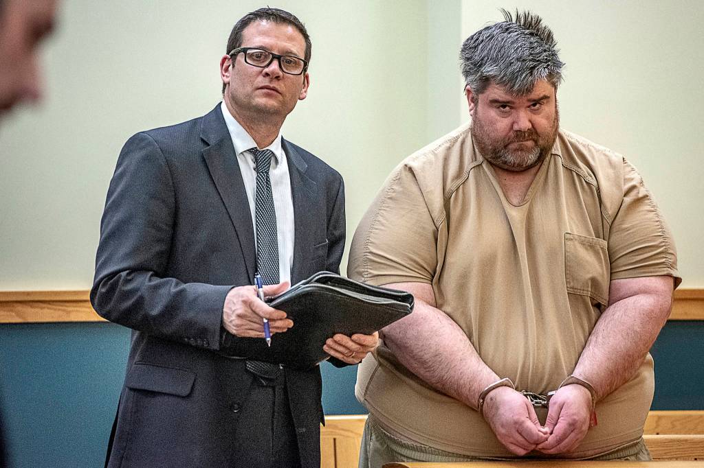 In this Feb. 19, 2019 photo, Steven Downs, 44, of Auburn, Maine, right, stands for his initial appearance in 8th District Court in Lewiston, Maine. (Andree Kehn | Sun Journal File)