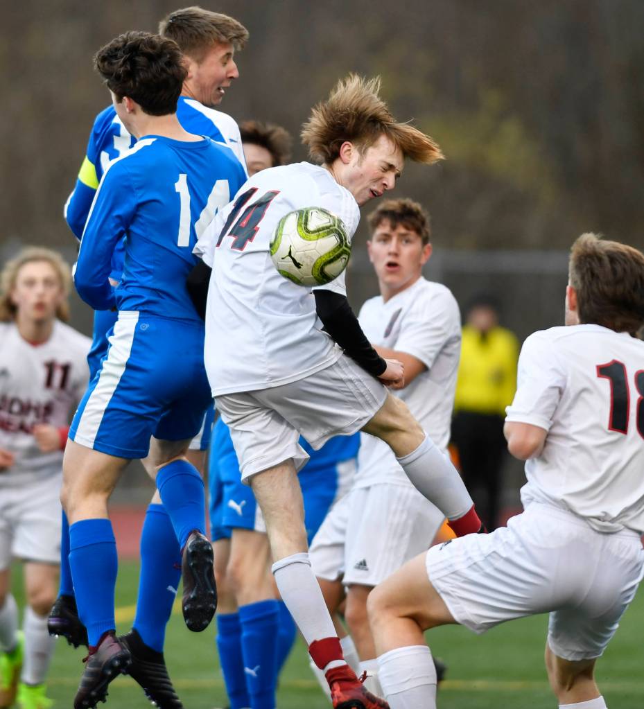 Juneau-Douglas’ Ronan Davies, left, takes a header against Thunder Mountain’s Wallace Adams during their game at TMHS on Tuesday, April 23, 2019. JDHS won 2-0. (Michael Penn | Juneau Empire)