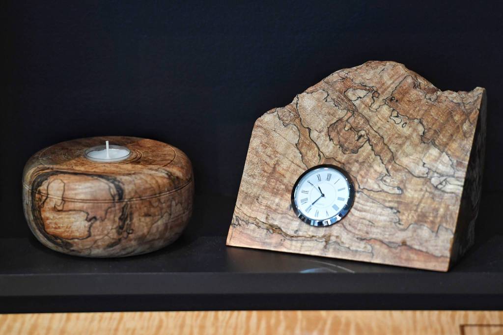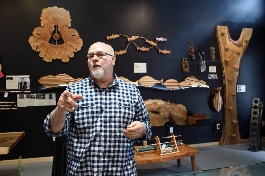 The crafts range widely in size — cutting boards and cupboards line parts of the walls — and price — an electric guitar retails at roughly $2,000, while a small toy whale is $20. Graber estimates 85 percent of the products were produced at his shop, with the remainder of the items coming from 14 Juneau artisans such as Henry Webb, Colin Dukes, George Gress and Jon Lyman.