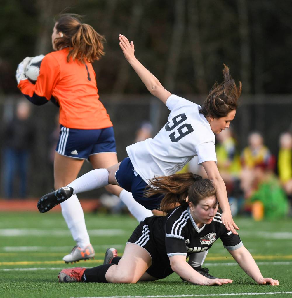 The physicality of the Juneau-Douglas girls soccer team’s nonconference game against Soldotna on Friday night reached its peak early in the second half.