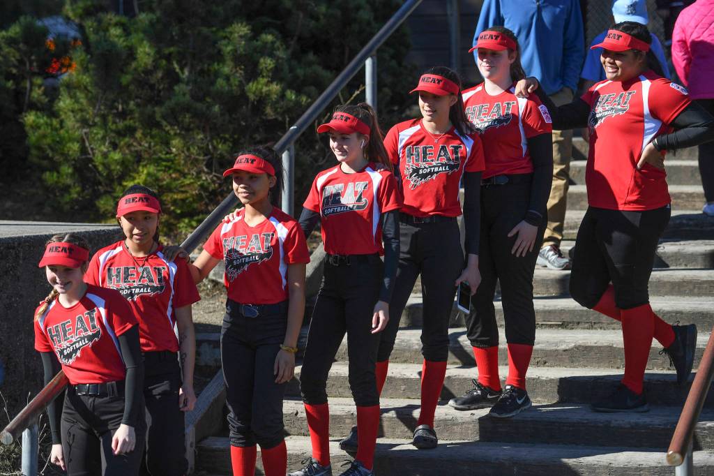 Makayla Harp throws out the first softball pitch to catcher Lily Hayes during the Gastineau Channel Little League Opening Day Ceremonies at Adair-Kennedy Memorial Park on Saturday, April 27, 2019. (Michael Penn | Juneau Empire)