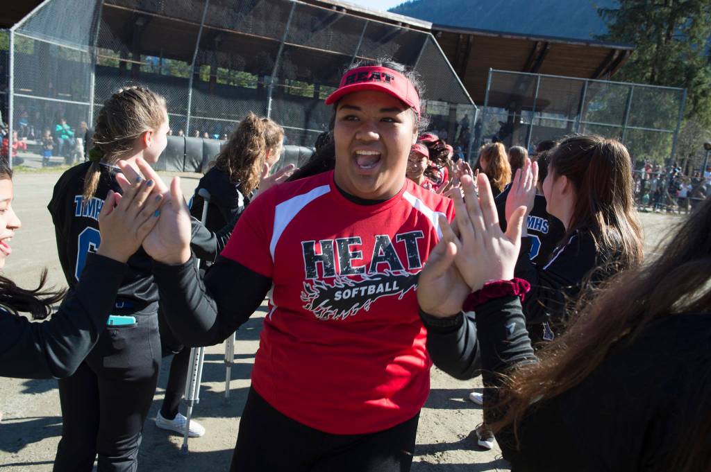 Players run a gauntlet of Thunder Mountain High School baseball and softball team players during the Gastineau Channel Little League Opening Day Ceremonies at Adair-Kennedy Memorial Park on Saturday, April 27, 2019. (Michael Penn | Juneau Empire)