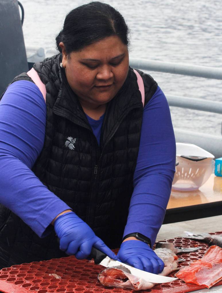 He stood across the table from Kaneisi Leha, who had long watched her family members fillet salmon but hadn’t done it herself before Saturday. The two carved into their salmon as a crowd watched closely, murmuring about each one’s approach and success.