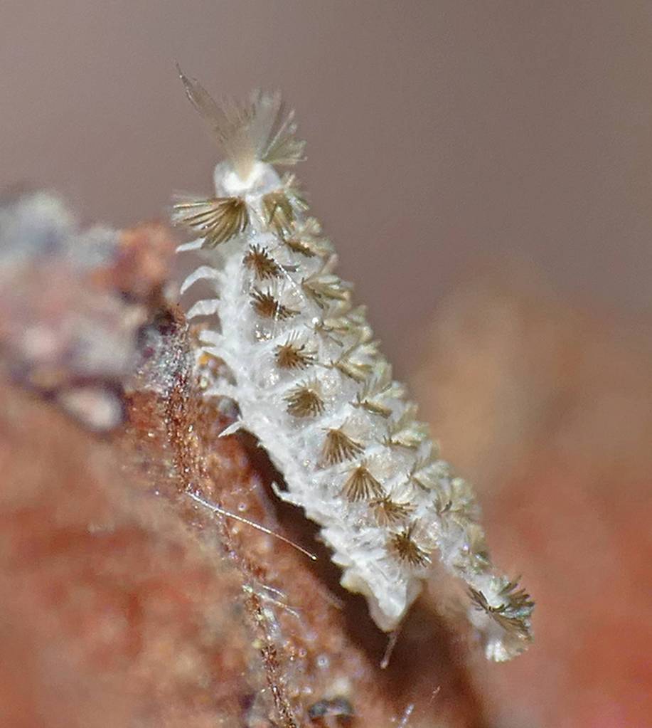 According to experts, this is a species of Polyxenus, probably Polyxenus lagurus, a widespread species. At the rear end of the body are two tufts of detachable, hooked spines — a sort of grappling hook — that form a defense against predatory ants and spiders.