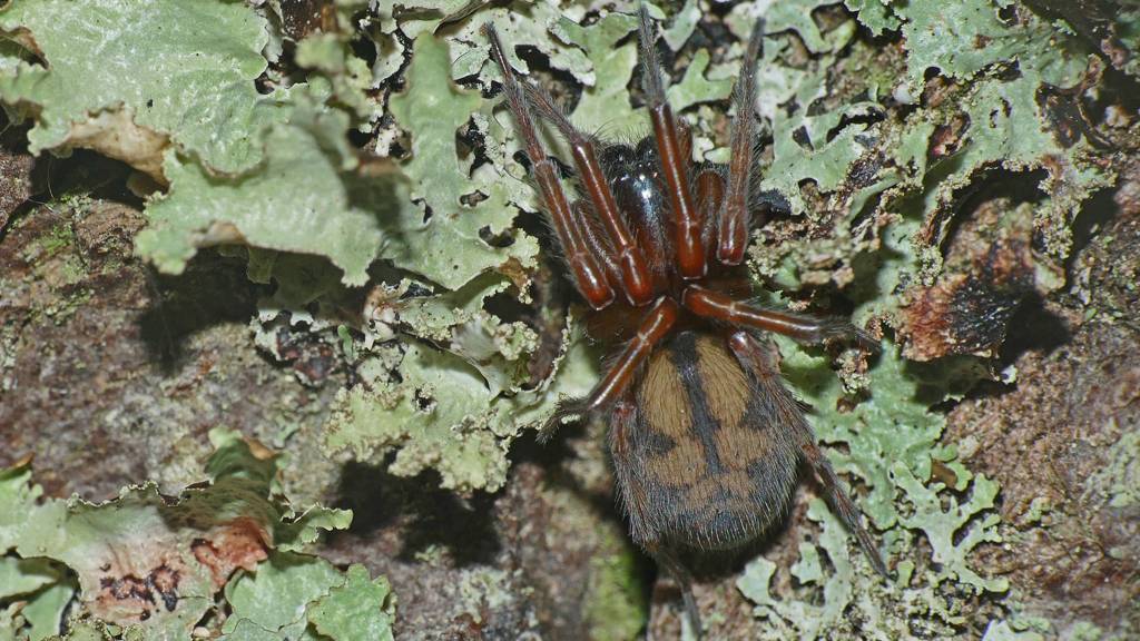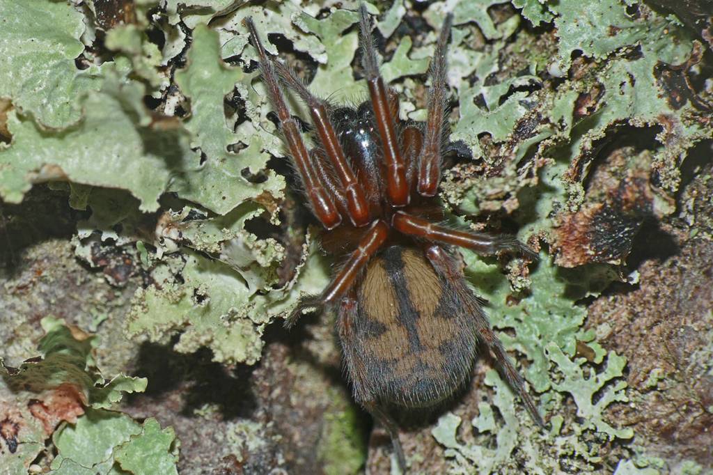 The other interesting creature under that flap of bark was a handsome spider, identified as a species of Callobius, a genus that occurs mostly in North America. They live under bark and stones or in the leaf litter. The common name is hacklemesh weaver or lace-weaver spider, named presumably for the loosely-woven, fuzzy-textured mesh with which they make a somewhat disorganized funnel web.