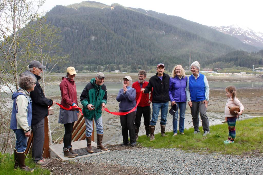 Donors and members of the Southeast Alaska Land Trust board cut a ceremonial ribbon to celebrate the opening of the Marjory and Edgar Huizer Fishing Access Site on Saturday, May 11, 2019. (Alex McCarthy | Juneau Empire)