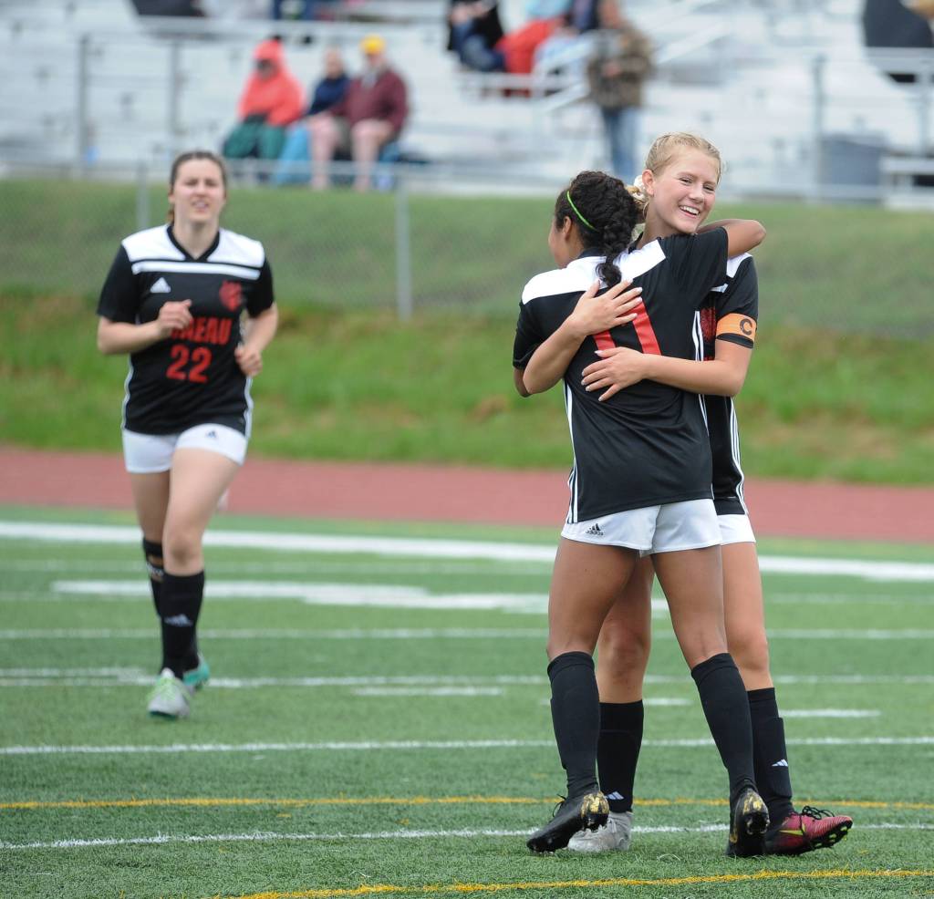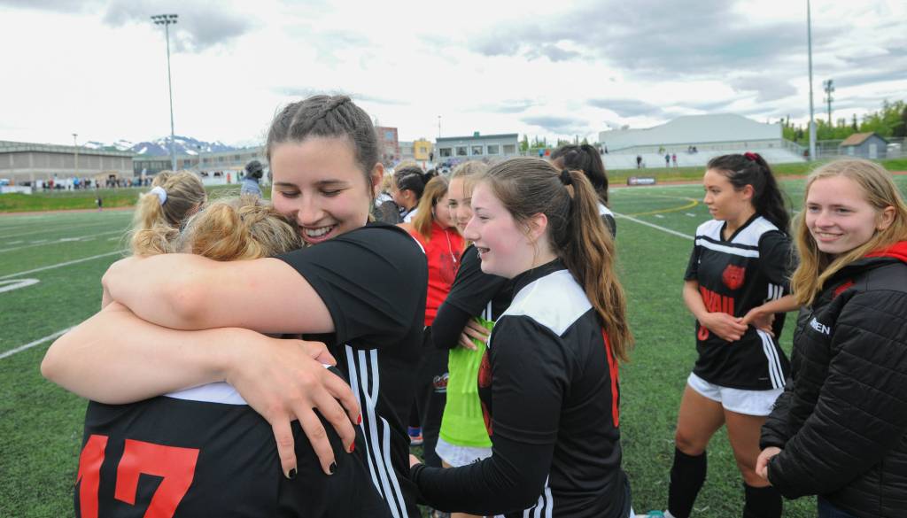 Juneau-Douglas’ Nikki Box, facing camera, hugs teammate Taylor Bentley immediately following the team’s 5-1 win over Soldotna in the ASAA/First National Bank Alaska soccer state championship match Saturday afternoon at Service High School in Anchorage. (Michael Dinneen | For the Juneau Empire)