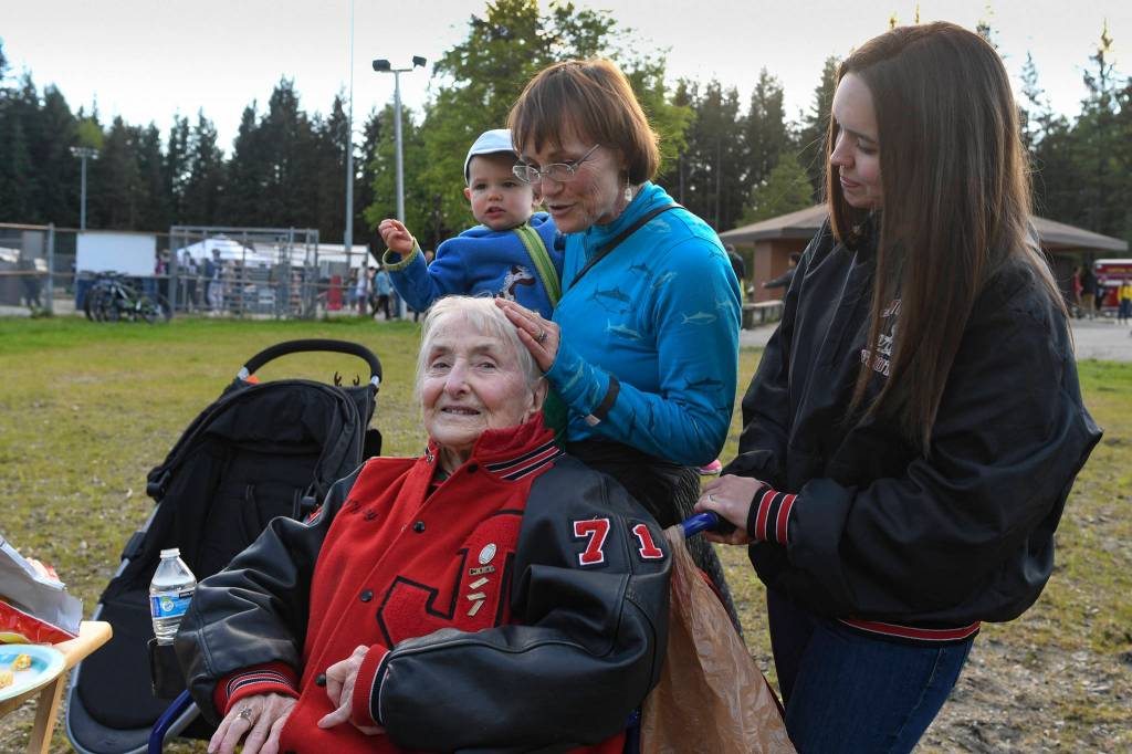 Charlotte Bain, 94, attends a tailgate party with her daughter, Claudia Bain, her granddaughter, Megan White, and her great-granddaughter, Louisa White, 21 months, before the Juneau Alumni Football Game with football players, dance team members and cheerleaders from Juneau-Douglas and Thunder Mountain High Schools at Adair-Kennedy Memorial Field on Friday, May 24, 2019. They were there to support Bain’s grandson, James, who was playing for the Juneau Legends. White graduated in 2000. (Michael Penn | Juneau Empire)