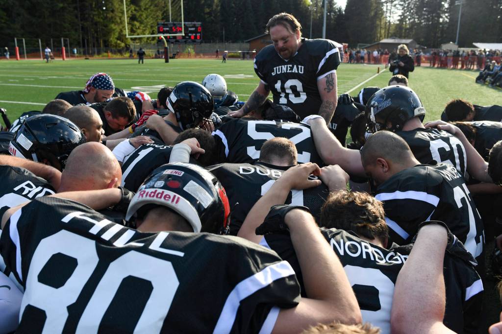 Chris Connally leads a prayer before the Juneau Alumni Football Game with football players, dance team members and cheerleaders from Juneau-Douglas and Thunder Mountain High Schools at Adair-Kennedy Memorial Field on Friday, May 24, 2019. (Michael Penn | Juneau Empire)
